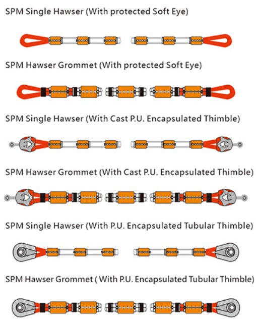 POLYAMIDE (NYLON) WITH JACKET is excellence in abrasion resistance and rope strength,which grants them the first choice for single point mooring applications. The ropes are spliced at both ends with galvanized cast thimbles and protective polyurethane coating to optimize the abrasion resistance. jacketed 12-strand polyamide ropes come with buoys so they float. This product is in compliance with OCIMF 2000 requirements.